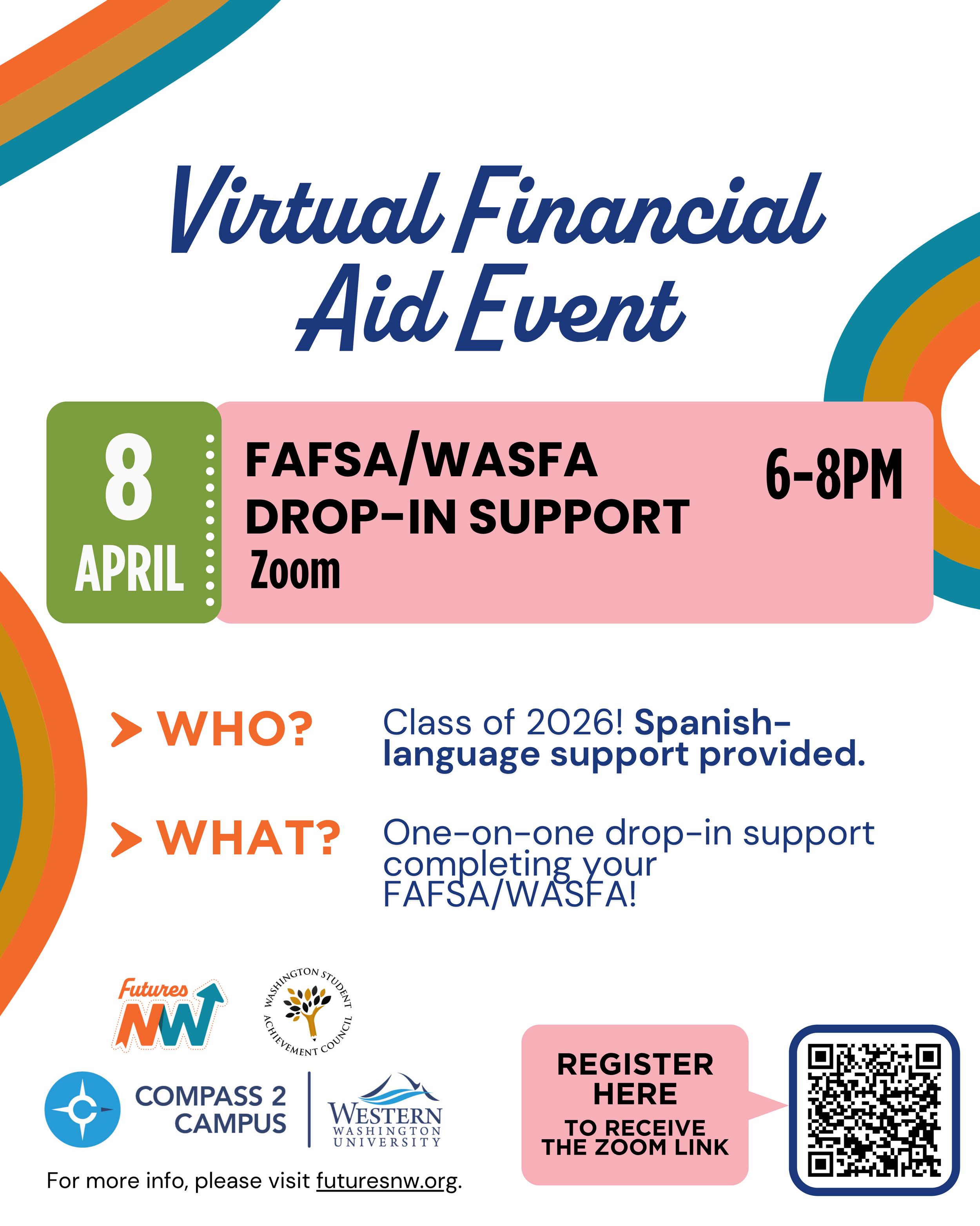 High school seniors and their families are invited to join our virtual Financial Aid Drop-In Support Session. Get one-on-one help with your FAFSA or WASFA, ask questions, and make real progress on your application.