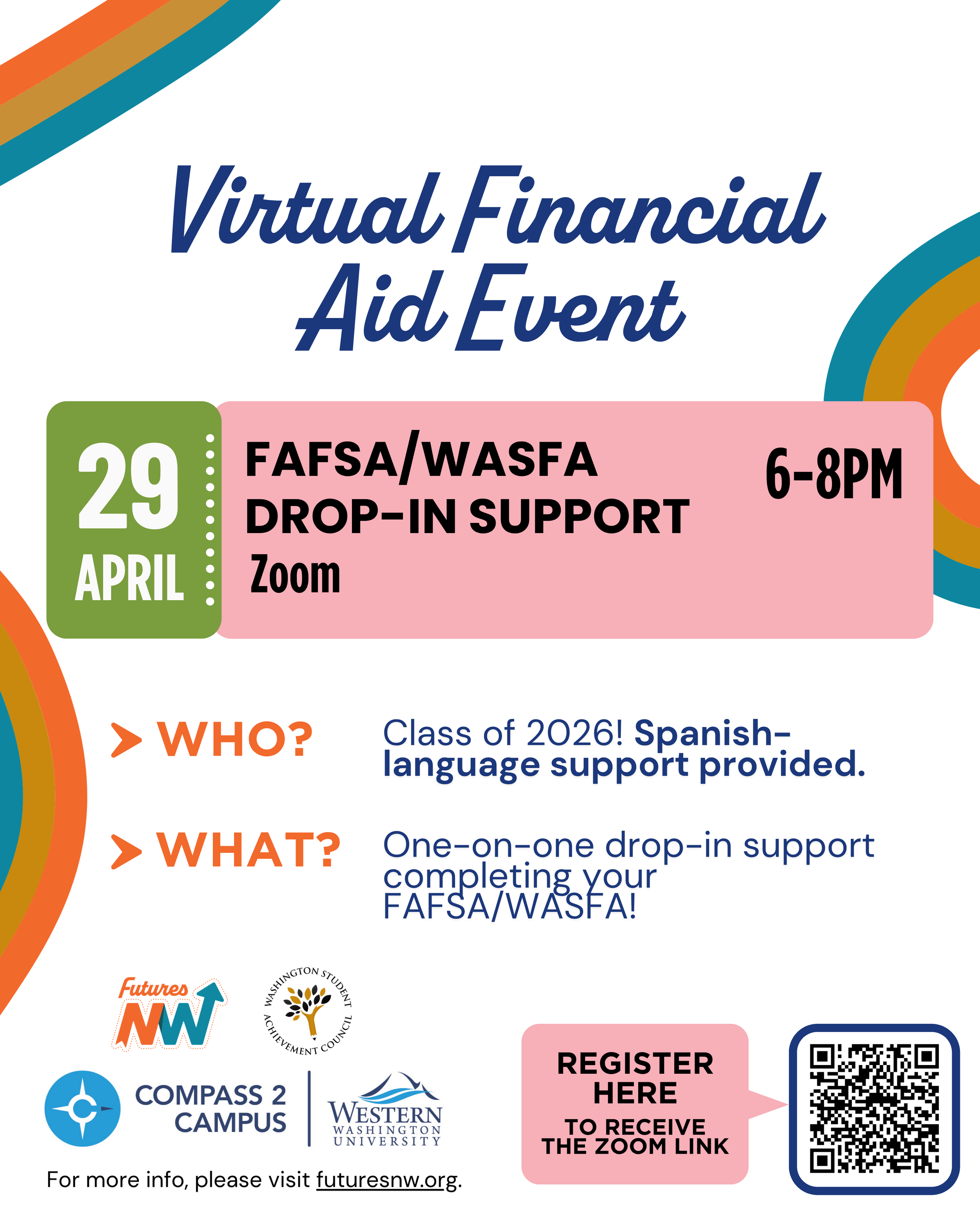 High school seniors and their families are invited to join our virtual Financial Aid Drop-In Support Session. Get one-on-one help with your FAFSA or WASFA, ask questions, and make real progress on your application.